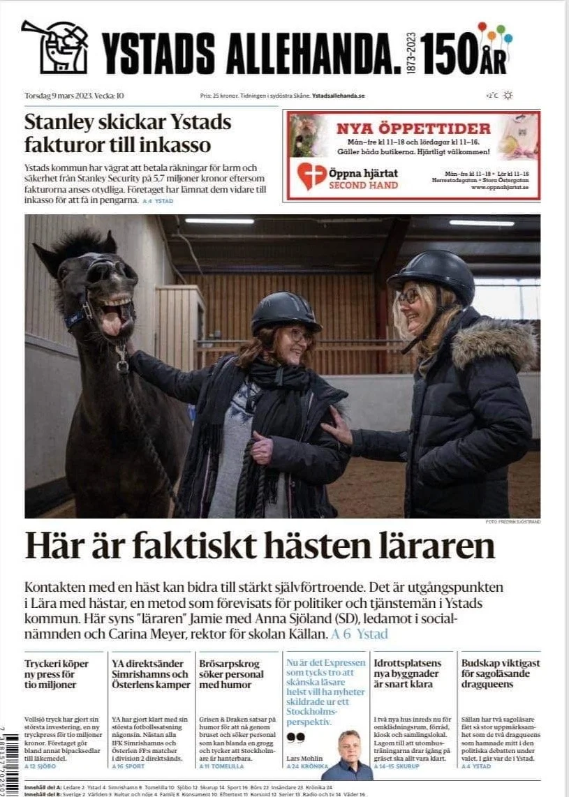 Lära med Hästar turnén 2023 besöker Ystad Ridklubb en snöig dag i mars. Trots trafikkaos och vädervarningar fanns över 20 politiker och beslutsfattare inom vård, skola och omsorg på plats för att lära sig mer om hästen som en välgörande kraft och resurs i kommunens hälsofrämjande arbete. Först föreläsning, därefter demo där två åhörare fick prova på att Lära med Hästar. Ystads Allehanda uppmärksammade besöket och gav oss förstasidan plus uppslag!